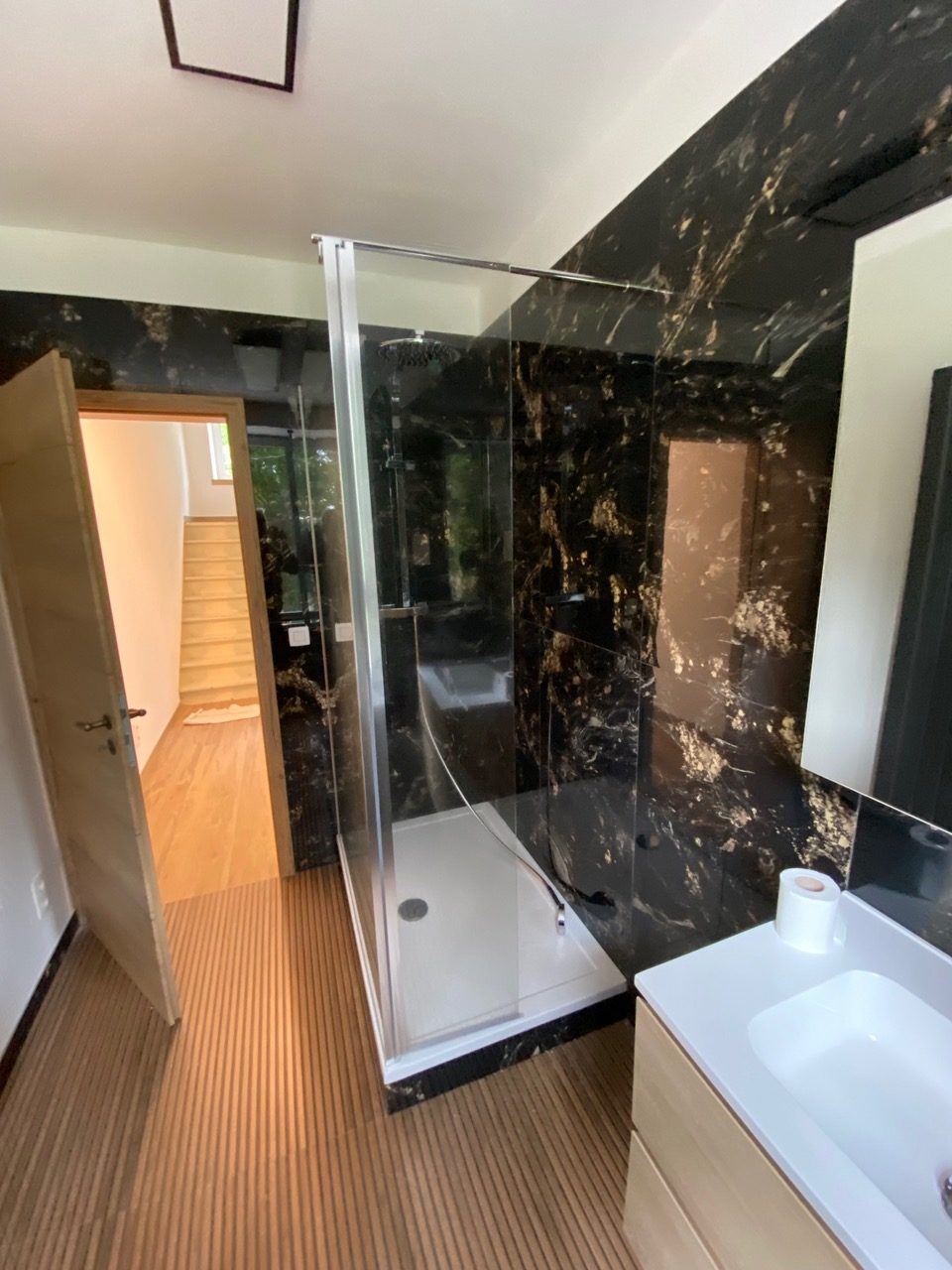 Tout le matériel à disposition à cet étage entièrement neuf, les châssis de fenêtre sont neufs, les portes sont neuves, plafonnage et peinture sont frais et neufs, carrelages sols et murs neufs, il n’y a ni coup ni tâche.